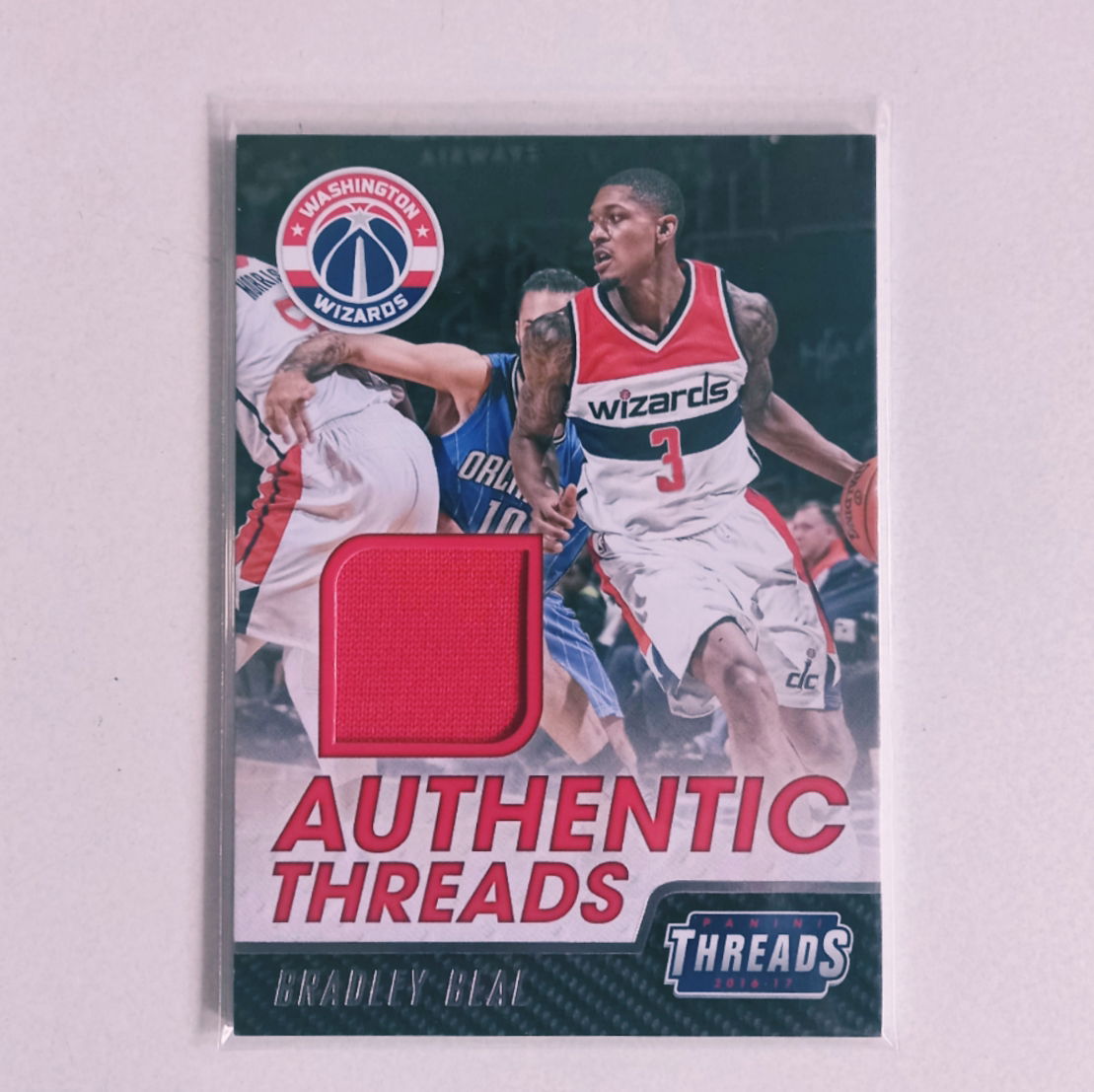 Tarjeta de Bradley Beal, insert Authentic Threads con pedazo de jersey usado por el jugador.
